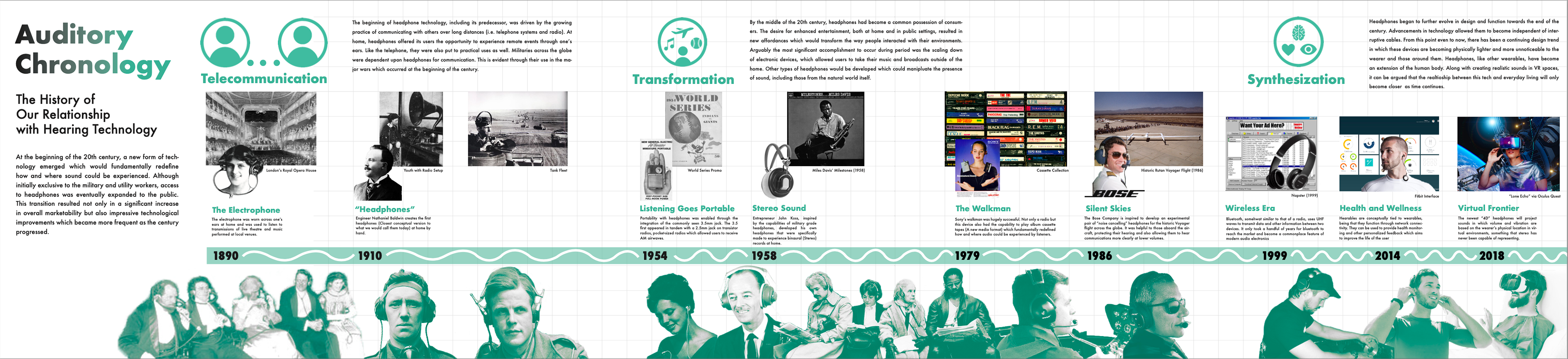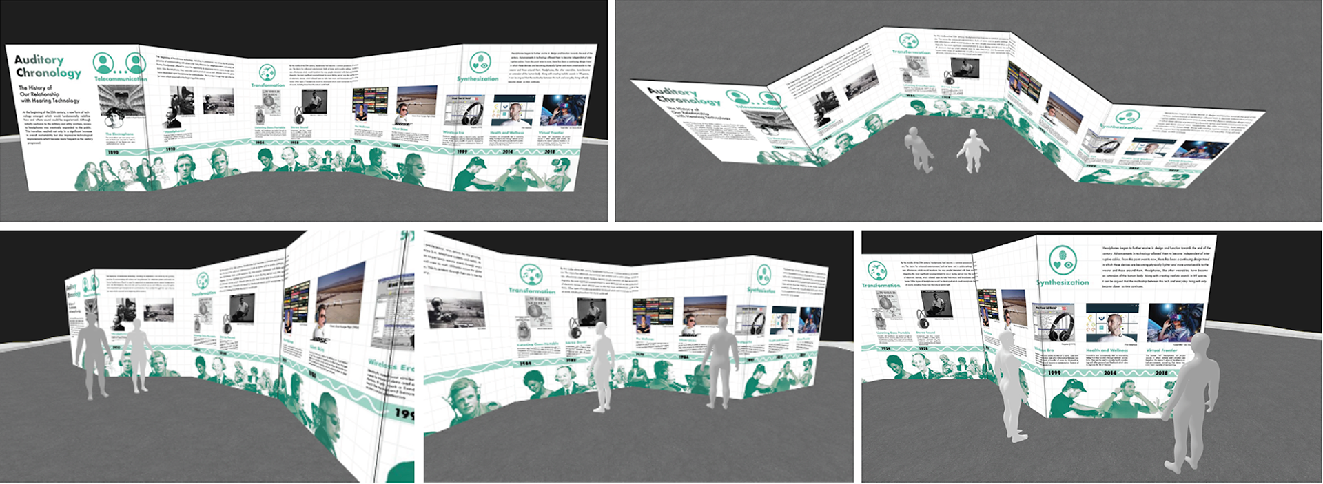 "Walkthrough" style exhibition design showcasing the evolution and progression of headphone technology.
