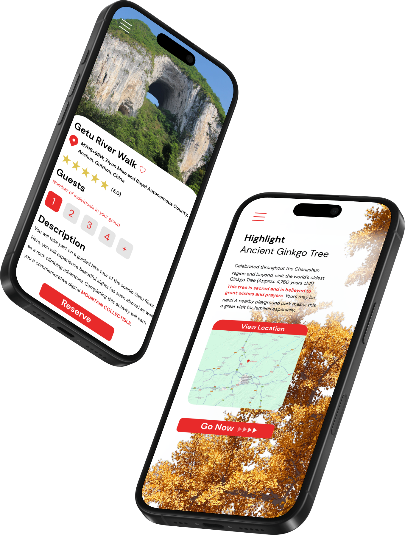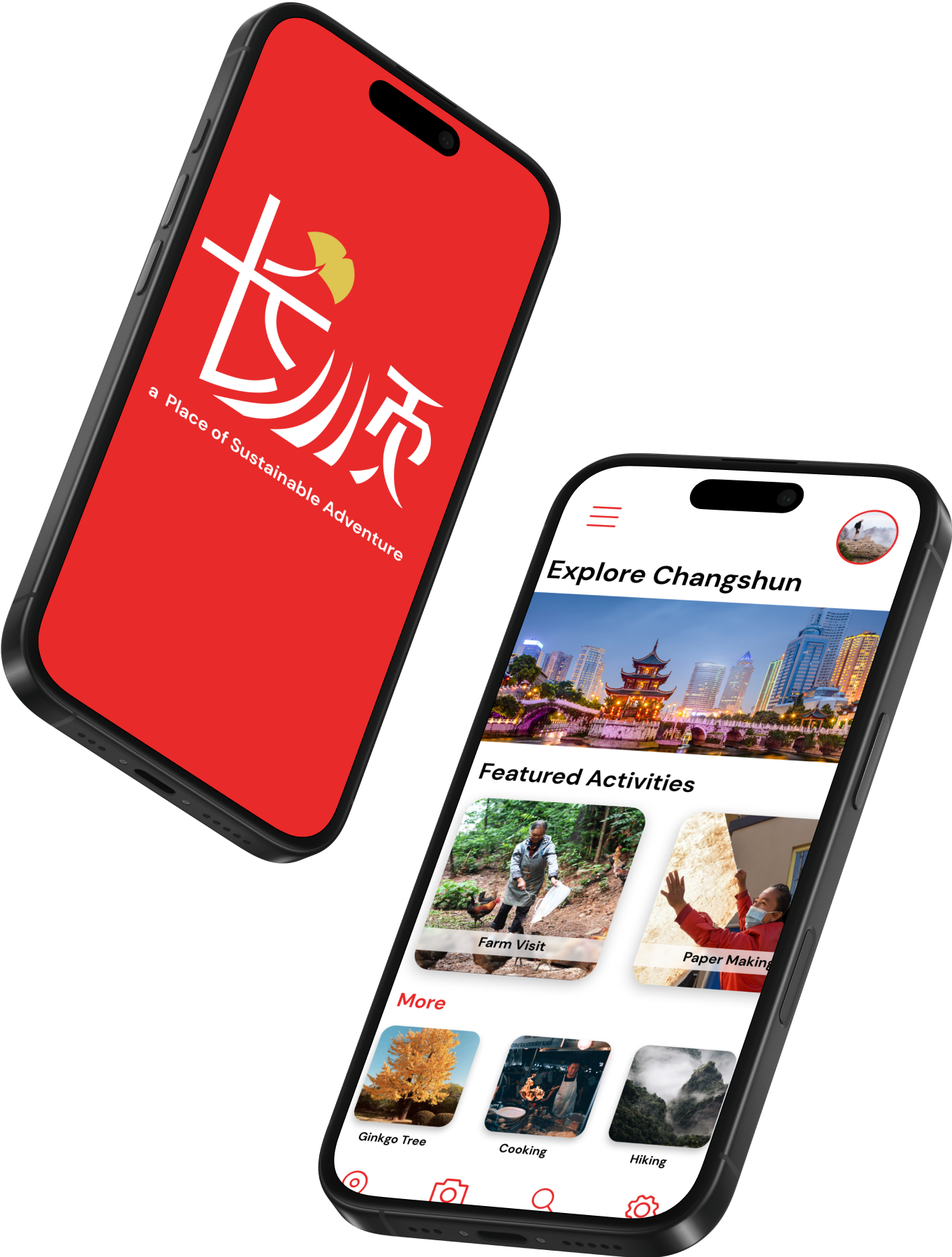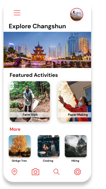 Mobile application designed to increase economic activity and travel through rural China. Featuring sustainable activities signature to the region (Changshun County, Guizhou Province.)