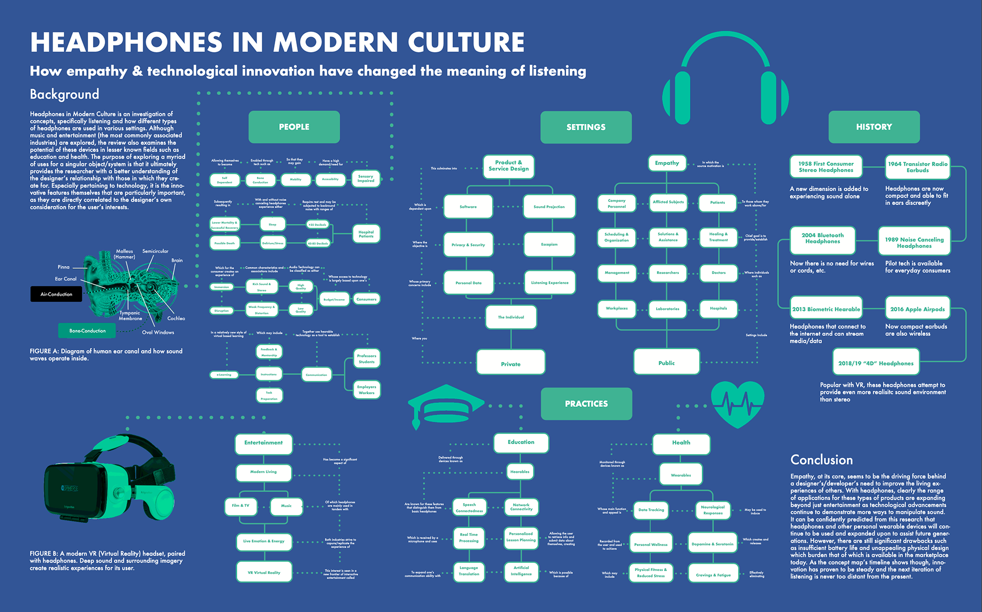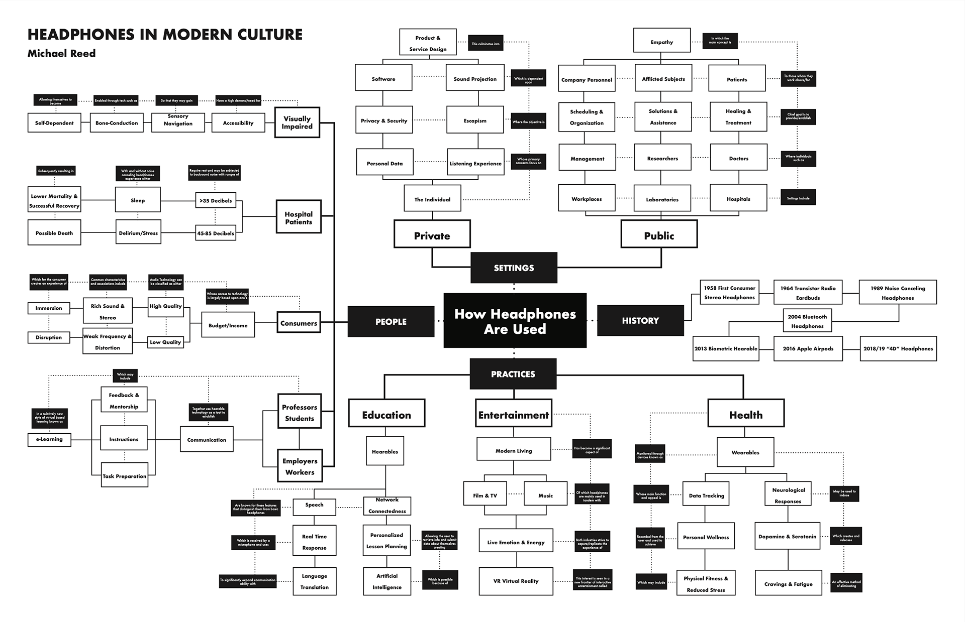 Visual mapping of research related to how headphones and other forms of hearing technology are used across different sectors.