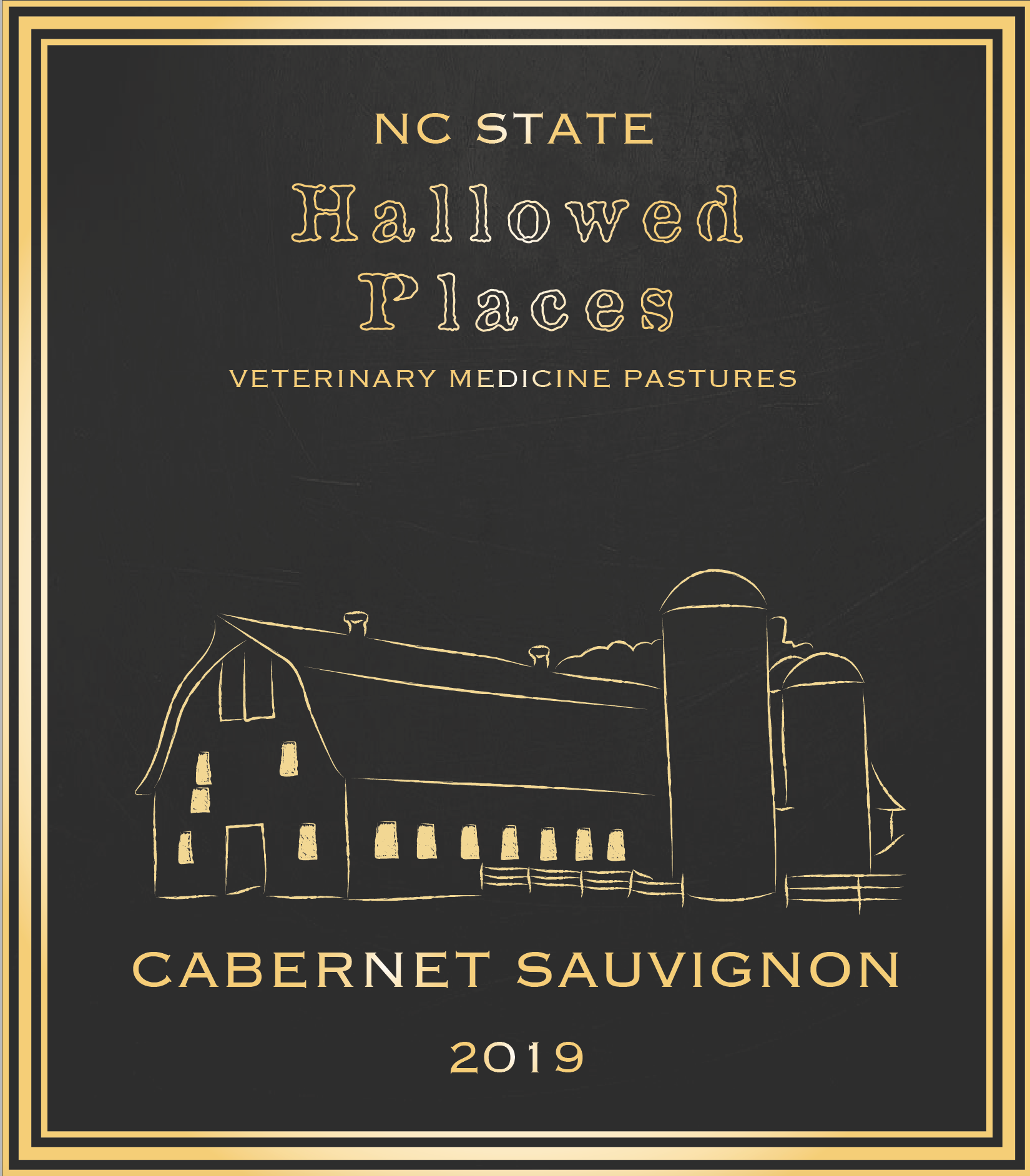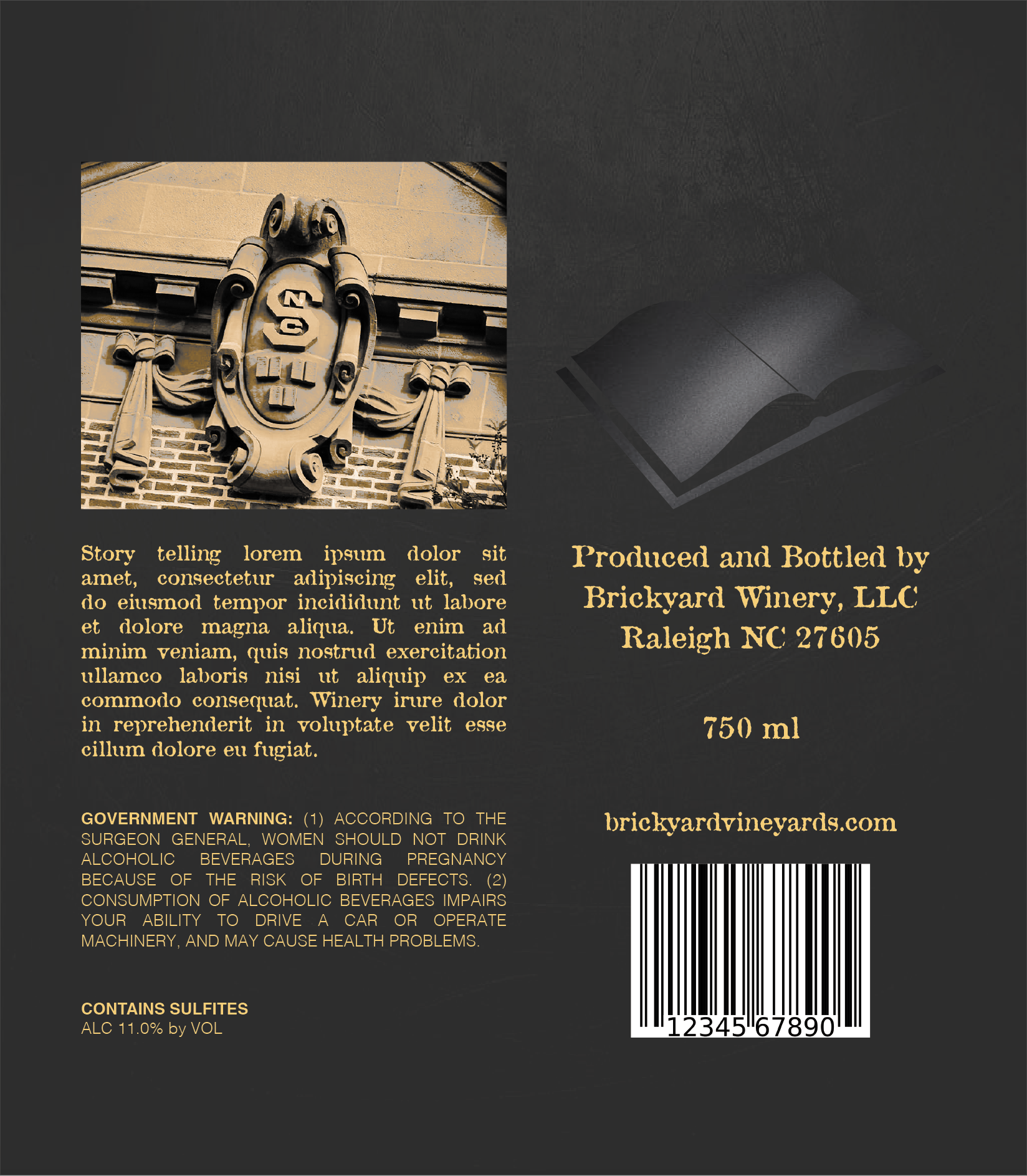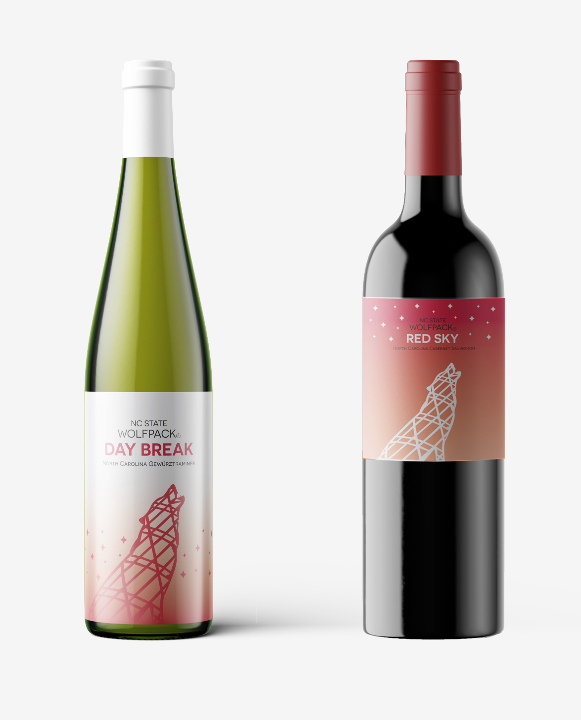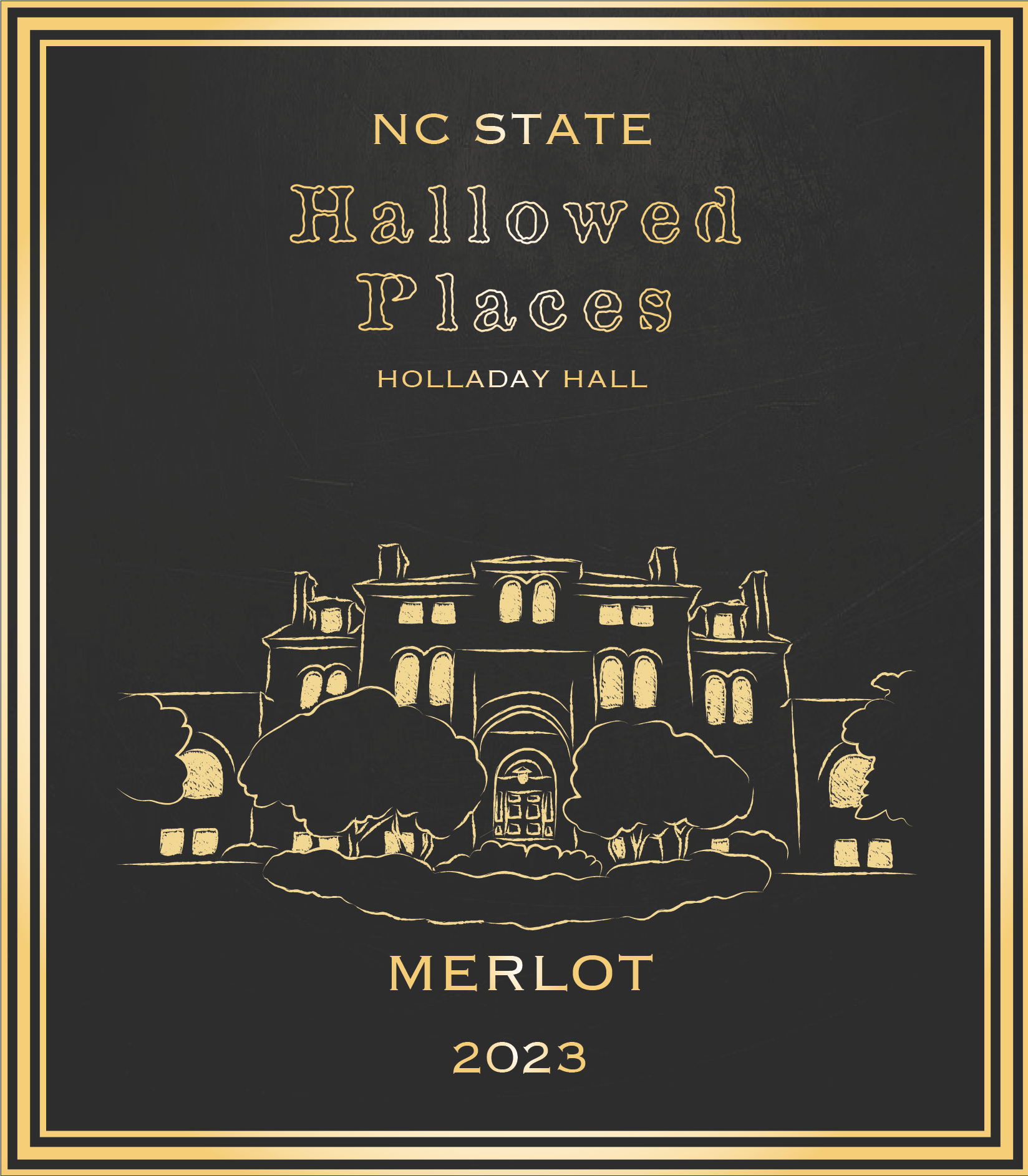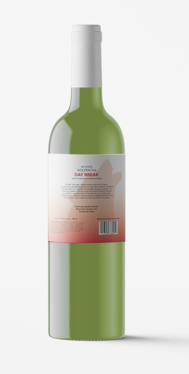 Label designs, mock upsĀ for North Carolina State University's bottled wine series (Red and White, Hallowed Places)