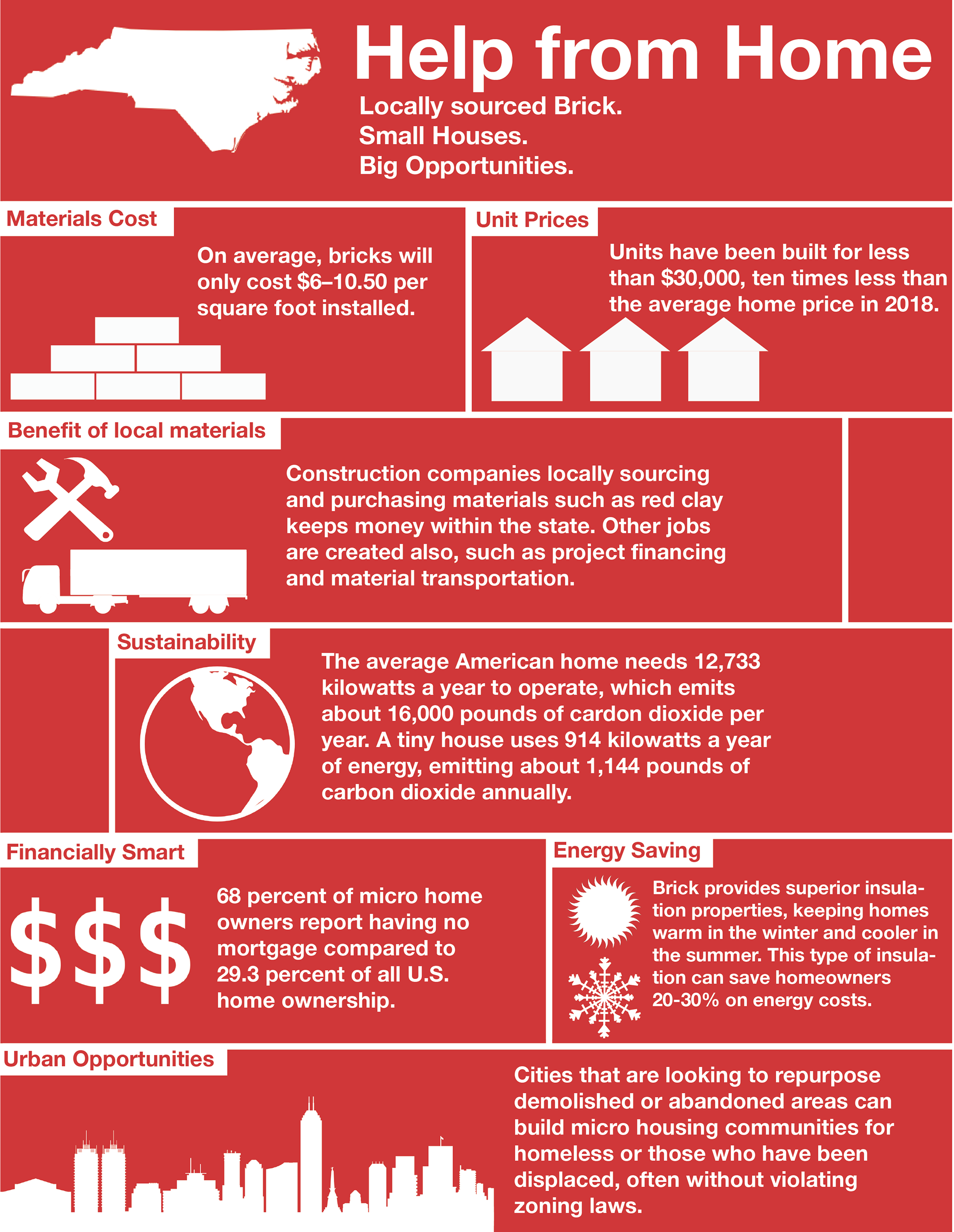 Poster designed to promote the opportunities/advantages of investing in micro home construction within North Carolina.