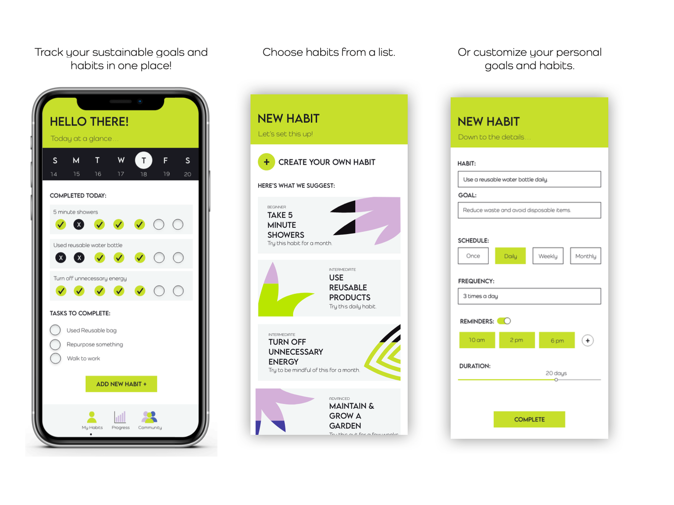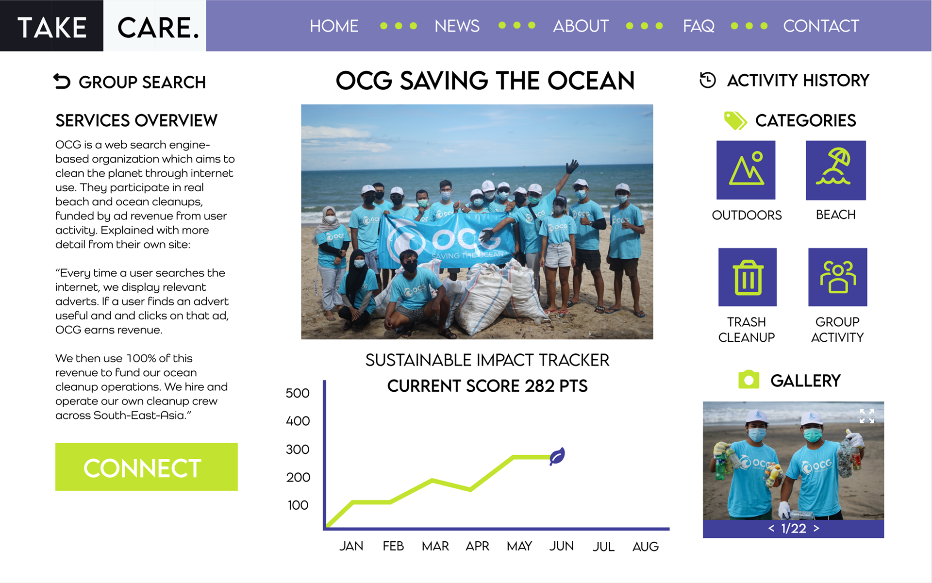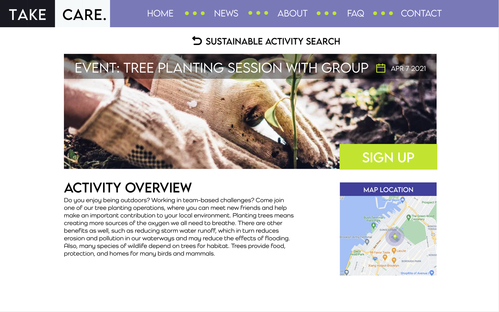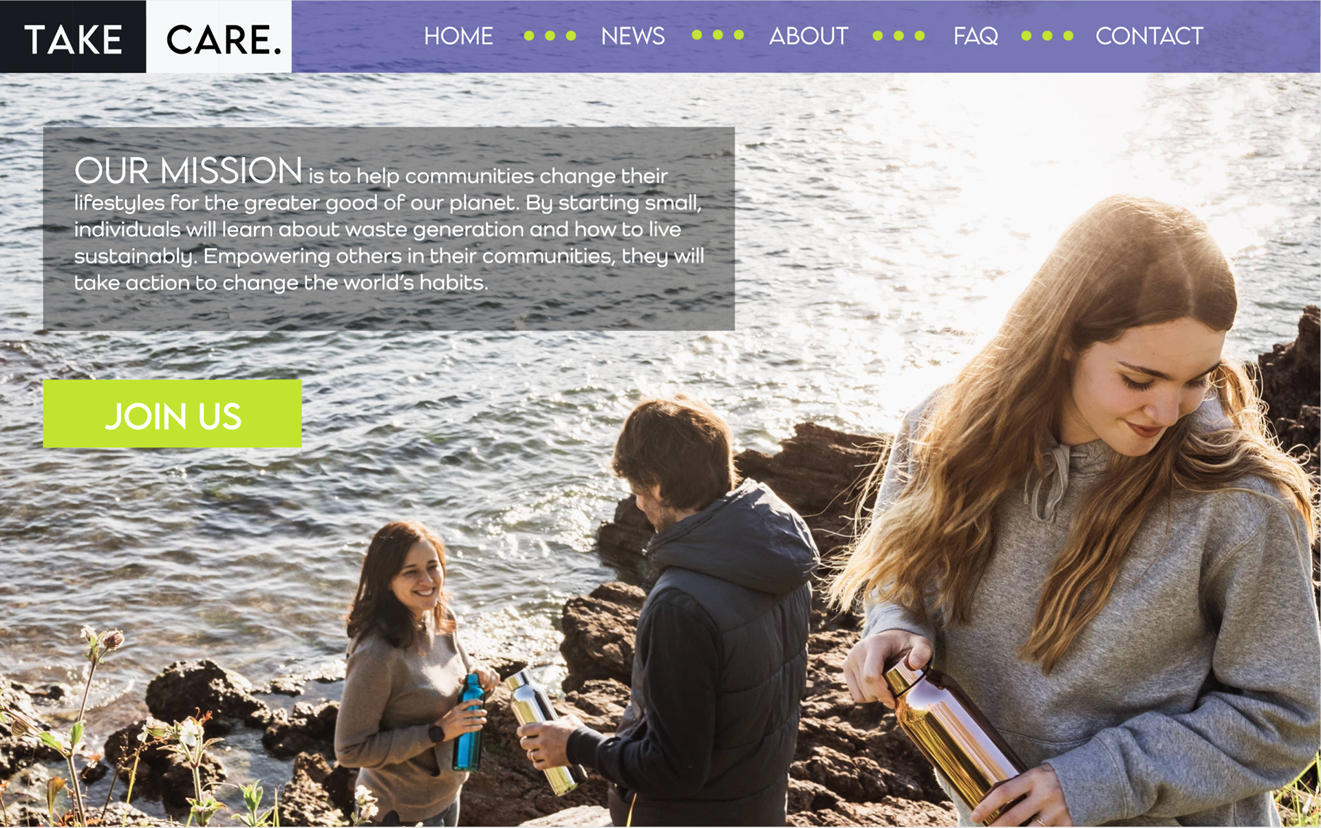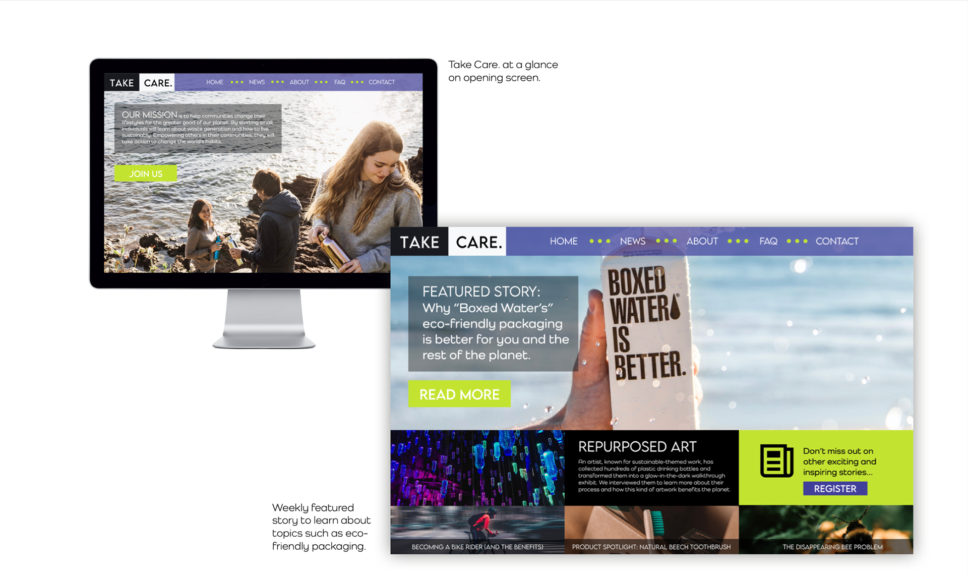 "Take Care" is a social media platform project aimed at uniting individuals that are interested in global sustainability and also better educating them in regard to reducing wasteful behaviors at home.